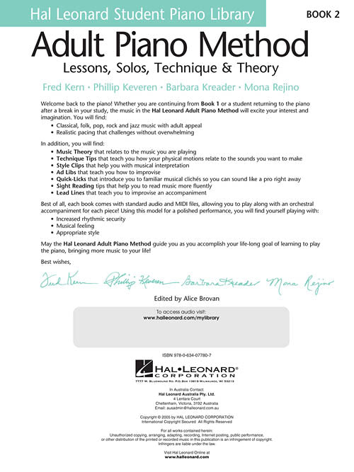 Adult Piano Method - Book 2 Lessons, Solos, Technique, & Theory Publisher: Hal Leonard Category: Educational Keyboard Series: Educational Piano Library Format: Softcover Audio Online The Adult Piano Method Book 2 begins with a brief review...Regular price $21.99 -