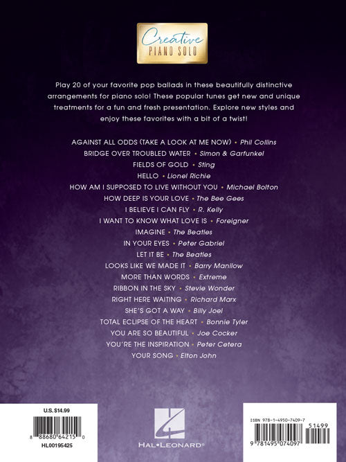 Pop Ballads - Creative Piano Solo Publisher: Hal Leonard Category: Keyboard & Piano/Vocal/Guitar Series: Piano Solo Songbook Format: Softcover 20 pop ballads creatively reimagined into fresh arrangements for the intermediate to advanced player. Includes: Against All...Regular price $21.99 -