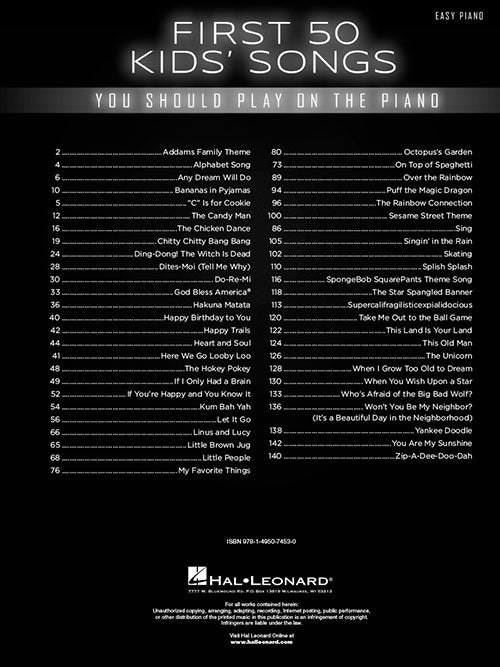 First 50 Kids' Songs You Should Play on the Piano Publisher: Hal Leonard Category: Keyboard & Piano/Vocal/Guitar Series: Easy Piano Songbook Format: Softcover The First 50 Series is designed for those beginners who feel they've had...Regular price $19.99 -