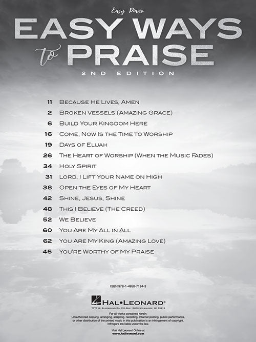 Easy Ways to Praise - 2nd Edition Publisher: Hal Leonard Category: Keyboard & Piano/Vocal/Guitar Series: Easy Piano Songbook Format: Softcover 15 contemporary favorites, including: Because He Lives, Amen · Come, Now Is the Time to Worship...Regular price $13.99 -