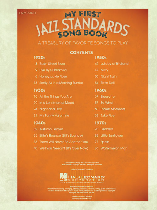My First Jazz Standards Song Book A Treasury of Favorite Songs to Play Publisher: Hal Leonard Category: Keyboard & Piano/Vocal/Guitar Series: Easy Piano Songbook Format: Softcover A keepsake collection of 24 classic jazz tunes, all arranged...Regular price $23.99 -