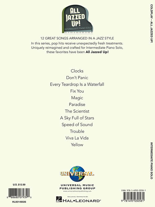Coldplay - All Jazzed Up! Publisher: Hal Leonard Category: Keyboard & Piano/Vocal/Guitar Series: Piano Solo Personality Format: Softcover In this series, pop hits receive unexpected fresh treatments. Uniquely reimagined and crafted for intermediate piano solo, these...Regular price $15.99 -