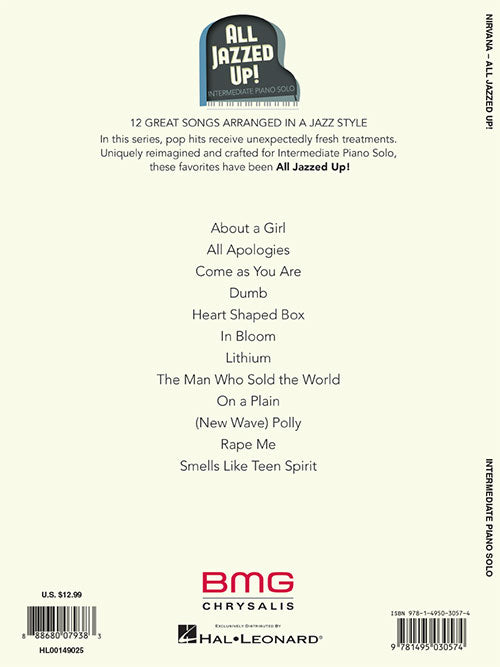 Nirvana - All Jazzed Up! Publisher: Hal Leonard Category: Keyboard & Piano/Vocal/Guitar Series: Piano Solo Personality Format: Softcover In this series, pop hits receive unexpected fresh treatments. Uniquely reimagined and crafted for intermediate piano solo, these...Regular price $15.99