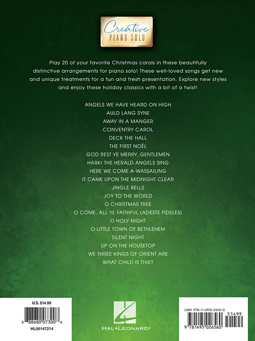 Christmas Carols - Creative Piano Solo Publisher: Hal Leonard Category: Keyboard & Piano/Vocal/Guitar Series: Piano Solo Songbook Format: Softcover Play 20 of your holiday favorites in these beautifully distinctive arrangements for piano solo! These familiar tunes...Regular price $17.99