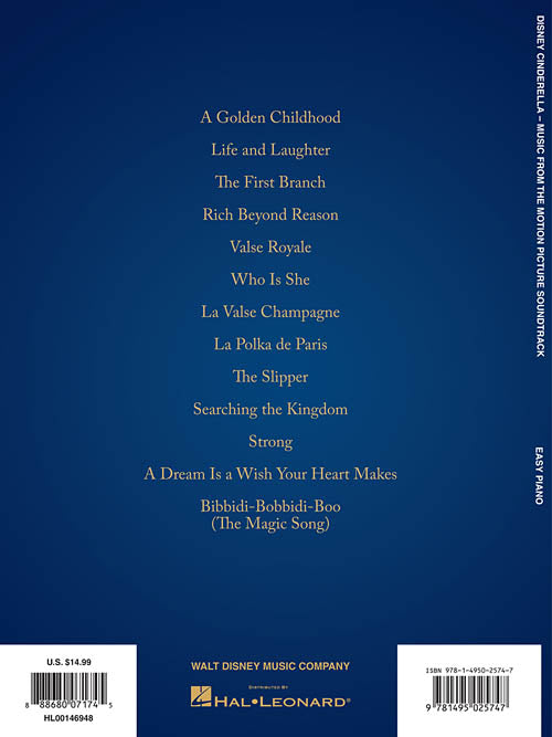 Cinderella Music from the Motion Picture Soundtrack Publisher: Hal Leonard Category: Keyboard & Piano/Vocal/Guitar Series: Easy Piano Songbook Format: Softcover 13 easy piano selections from the soundtrack complete with beautiful full-color photor from this 2015 live-action...Regular price $17.99 -