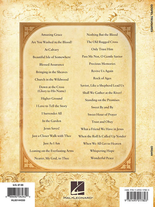 Composer: Various Gospel Treasures Softcover 35 gospel favorites for organ: Amazing Grace ยท Blessed Assurance ยท Higher Ground ยท I Love to Tell the Story ยท In the Garden ยท Just a Closer Walk with Thee...Regular price $9.99 -