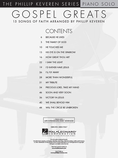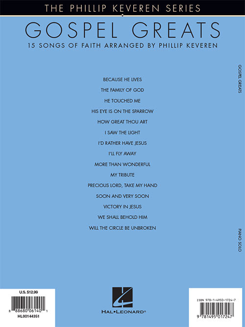 Gospel Greats arr. Phillip Keveren The Phillip Keveren Series Piano Solo Publisher: Hal Leonard Category: Keyboard & Piano/Vocal/Guitar Series: Piano Solo Songbook Format: Softcover 15 gospel favorites expertly arranged by Phillip Keveren, including: Because He Lives...Regular price $17.99 -