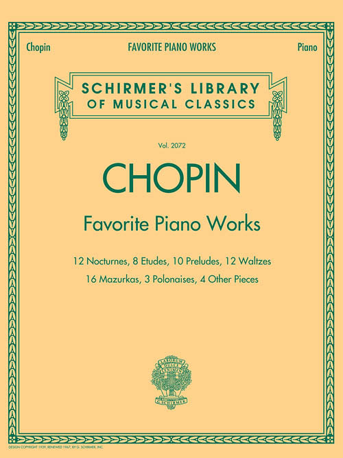Favorite Piano Works Schirmer Library of Classics Volume 2072 Publisher: G. Schirmer, Inc. Category: Keyboard & Piano/Vocal/Guitar Series: Piano Collection Format: Softcover Well-known Chopin works in one affordable volume, including 10 preludes, 16 mazurkas, 12 nocturnes,...Regular price $22.99 -