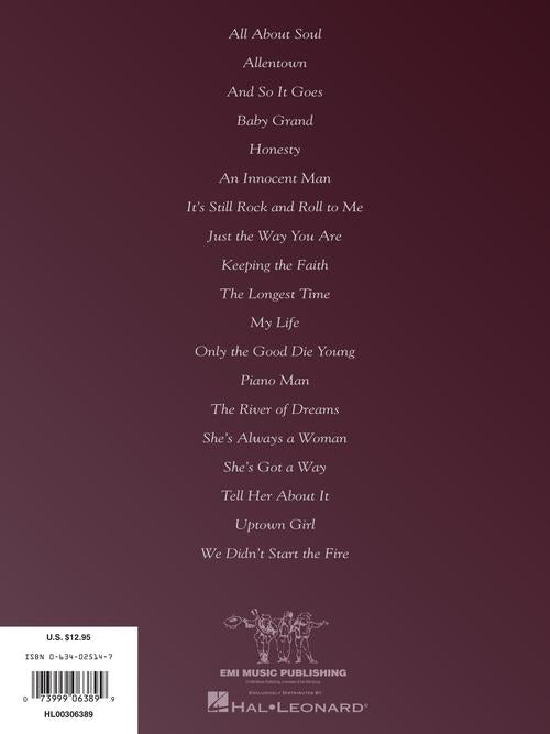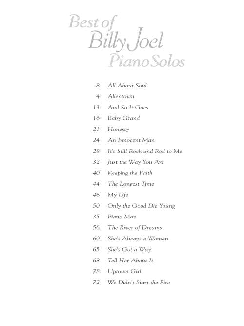 Best of Billy Joel Piano Solos Publisher: Hal Leonard Category: Keyboard & Piano/Vocal/Guitar Series: Piano Solo Personality Format: Paperback Features solo piano arrangements of 19 huge hits from this pop superstar: All About Soul · Allentown...Regular price $29.99 -