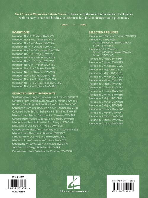Intermediate J.S. Bach Favorites The Classical Piano Sheet Music Series Publisher: Hal Leonard Category: Keyboard & Piano/Vocal/Guitar Series: Piano Format: Softcover The Classical Piano Sheet Music Series includes compilations of intermediate level pieces, with convenient coil...Regular price $15.99
