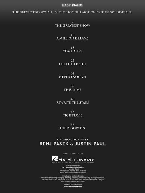 The Greatest Showman Music from the Motion Picture Soundtrack Publisher: Hal Leonard Category: Keyboard & Piano/Vocal/Guitar Series: Easy Piano Songbook Format: Softcover A musical drama biopic chronicling P.T. Barnum (played by Hugh Jackman) and his founding...Regular price $27.99 -