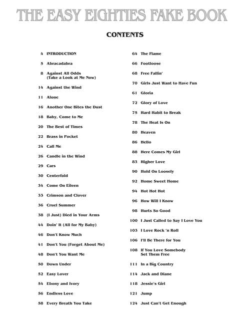 The Easy Eighties Fake Book 100 Songs in the Key of C Publisher: Hal Leonard Category: Keyboard & Piano/Vocal/Guitar Series: Easy Fake Book Format: Softcover 100 '80s favorites, all made easy-to-play with simplified, yet authentic-sounding chords...Regular price $33.99 -