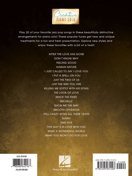 Jazz Pop Songs - Creative Piano Solo Publisher: Hal Leonard Category: Keyboard & Piano/Vocal/Guitar Series: Piano Solo Songbook Format: Softcover Looking to add some variety to your playing? Check out the Creative Piano Solos series that...Regular price $23.99 -
