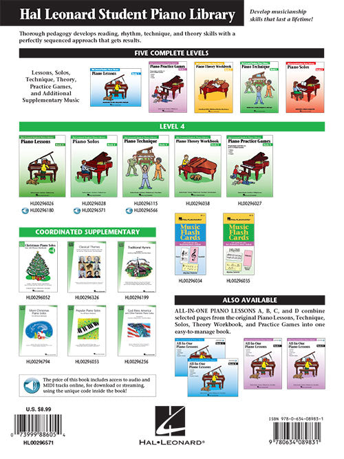 Piano Solos Book 4 - Book with Online Audio Hal Leonard Student Piano Library Publisher: Hal Leonard Category: Educational Keyboard Series: Educational Piano Library Format: Softcover Audio Online Piano Solos books feature original performance repertoire from...Regular price $13.99 -