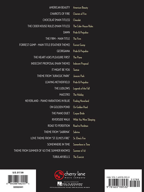 Greatest Piano Themes from the Movies Publisher: CHERRY LANE MUSIC Category: Keyboard & Piano/Vocal/Guitar Series: Piano Solo Songbook Format: Softcover Solo arrangements of 25 great movie themes originally played on piano. Includes: American Beauty · Chariots...Regular price $27.99 -