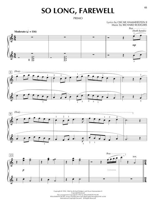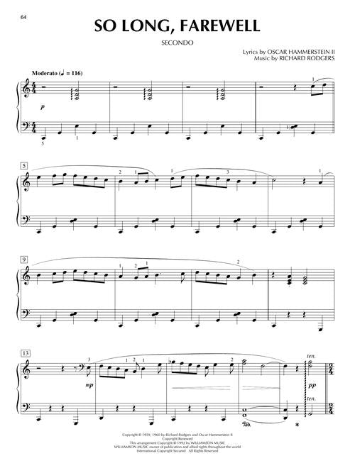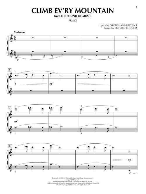 The Sound of Music Piano Duet Play-Along Volume 10 Publisher: Hal Leonard Category: Keyboard & Piano/Vocal/Guitar Series: Piano Duet Play-Along Format: Softcover Audio Online 10 songs from the classic musical, including: Climb Ev'ry Mountain · Do-Re-Mi...Regular price $21.99 -