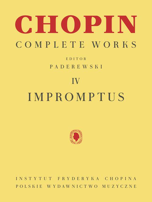 Composer: Frederic Chopin Impromptus Chopin Complete Works Vol. IV Publisher: PWM Edition Category: Keyboard & Piano/Vocal/Guitar Series: PWM Format: Softcover The most famous and popular edition of Chopin's works prepared by I. J. Paderewski, L. Bronarski...Regular price $19.99 -