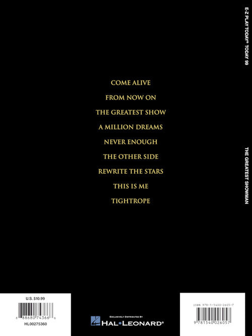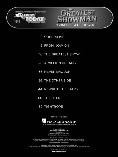 The Greatest Showman E-Z Play Today #99 Publisher: Hal Leonard Category: Keyboard & Piano/Vocal/Guitar Series: E-Z Play Today Format: Softcover 9 selections from this blockbuster hit movie musical, arranged in our easy to read and play...Regular price $20.99 -