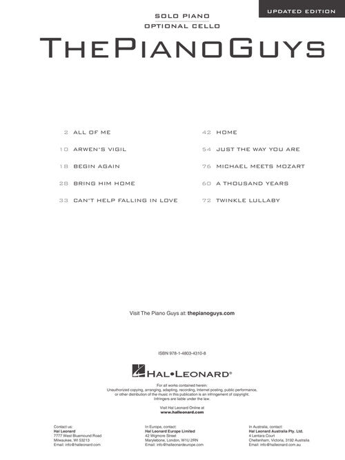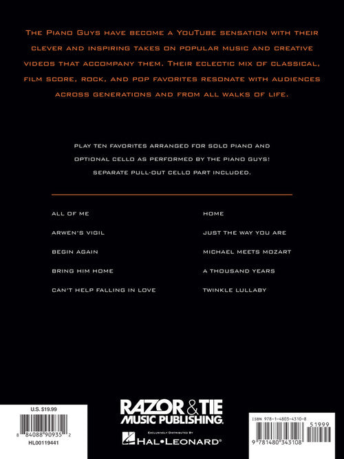 Artist: The Piano Guys The Piano Guys Solo Piano with Optional Cello Softcover The Piano Guys started as YouTube sensations with their clever and inspiring takes on popular music and the creative videos that accompany them....Regular price $32.99 -