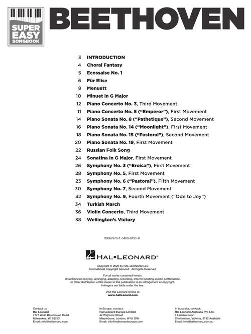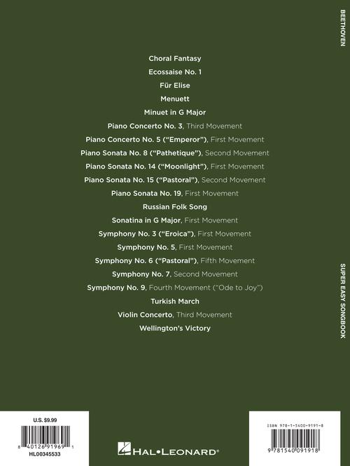 Beethoven - Super Easy Songbook Publisher: Hal Leonard Category: Keyboard & Piano/Vocal/Guitar Series: Super Easy Songbook Format: Softcover It's super easy! This series features accessible arrangements for piano, with simple right-hand melody, letter names inside each...Regular price $13.99 -