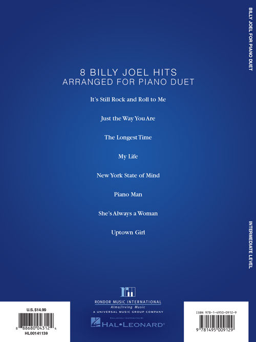 Artist: Billy Joel Billy Joel for Piano Duet 1 Piano, 4 Hands / Intermediate Level Softcover Includes 8 of the Piano Man's greatest hits arranged for 1 piano/4 hands. Perfect as recital encores, or just for...Regular price $20.99 -