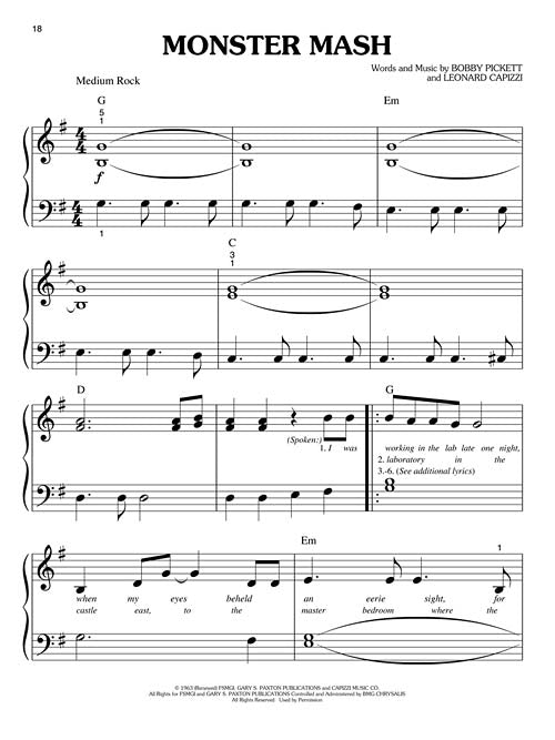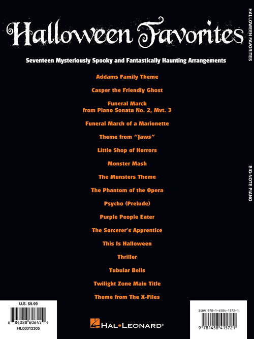 Composer: Various Halloween Favorites Publisher: Hal Leonard Category: Keyboard & Piano/Vocal/Guitar Series: Big Note Songbook Format: Softcover Here are mysteriously spooky and fantastically haunting arrangements of 17 favorites: Addams Family Theme · Funeral March · Theme...Regular price $17.99