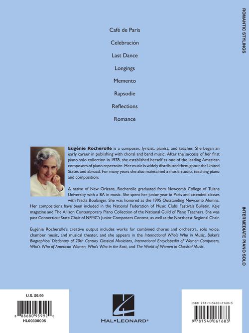 Romantic Stylings The Eugénie Rocherolle Series Intermediate Piano Solos Publisher: Hal Leonard Category: Keyboard & Piano/Vocal/Guitar Series: Educational Piano Library Format: Softcover Eight wistful, creative and playable originals in a romantic style for intermediate piano solo....Regular price $11.99 -