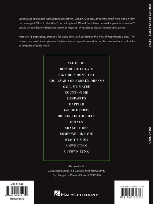 Pop Songs in a Classical Style for Piano Solo Publisher: Hal Leonard Category: Keyboard & Piano/Vocal/Guitar Series: Piano Solo Songbook Format: Softcover What would composer such as Bach, Beethoven, Chopin, Debussy, or Rachmaninoff have done if...Regular price $21.99 -