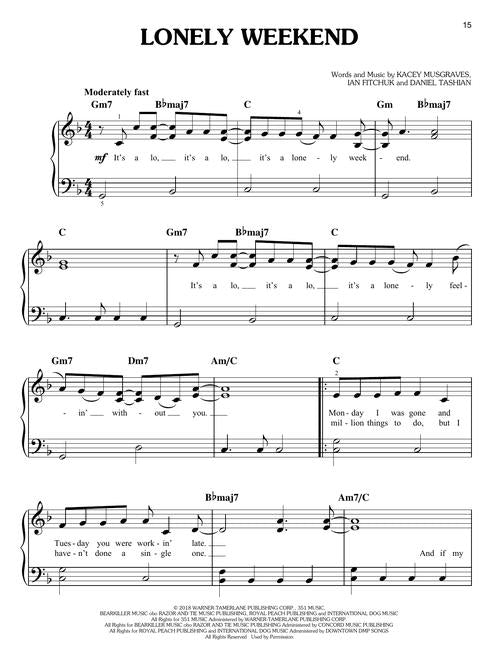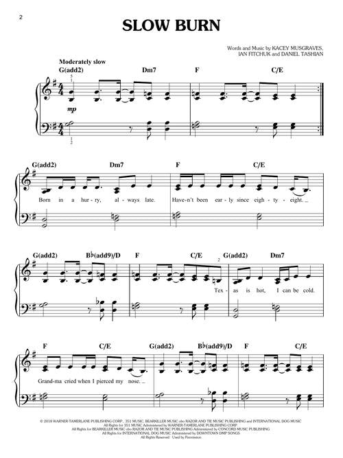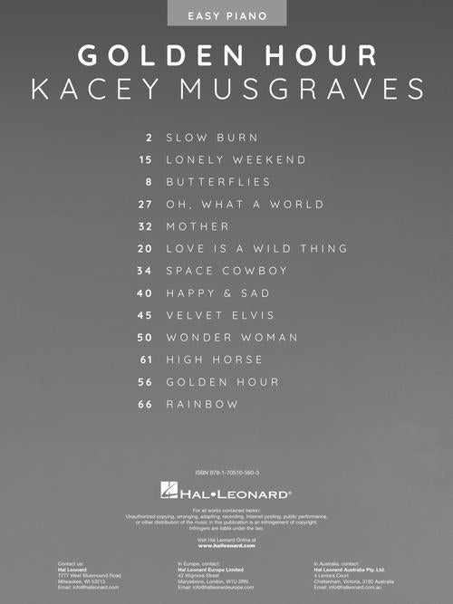 Kacey Musgraves - Golden Hour Publisher: Warner/Chappell Music Category: Keyboard & Piano/Vocal/Guitar Series: Easy Piano Personality Format: Softcover 13 tracks from the 2019 Grammy® and CMA award winner for Album of the Year by country diva...Regular price $23.99 -