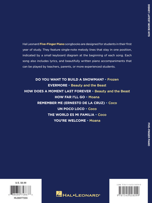 Disney Latest Movie Hits Publisher: Hal Leonard Category: Educational Keyboard Series: Five Finger Piano Songbook Format: Softcover Eight easy, playable arrangements of recent Disney movie hit songs arranged in five finger piano notation. Includes: Do You...Regular price $15.99 -