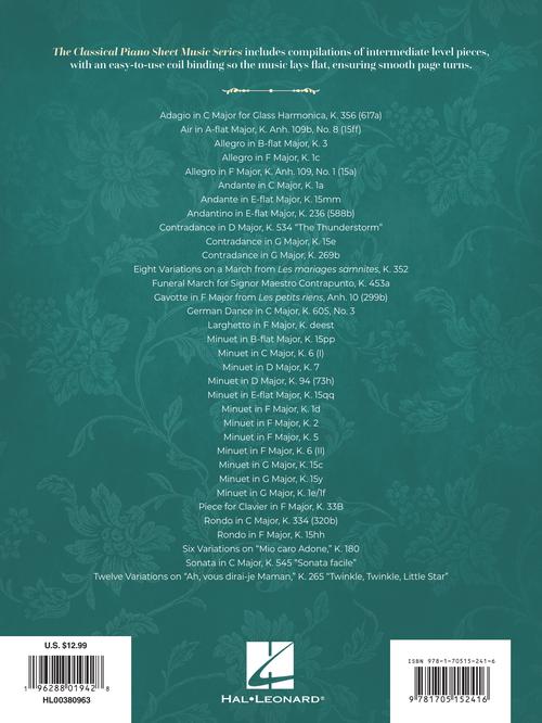 Intermediate Mozart Favorites The Classical Piano Sheet Music Series Publisher: Hal Leonard Category: Keyboard & Piano/Vocal/Guitar Series: Piano Format: Softcover Adagio in C Major for Glass Harmonica, K. 356 (617a) · Air in A-flat Major, K....Regular price $15.99 -