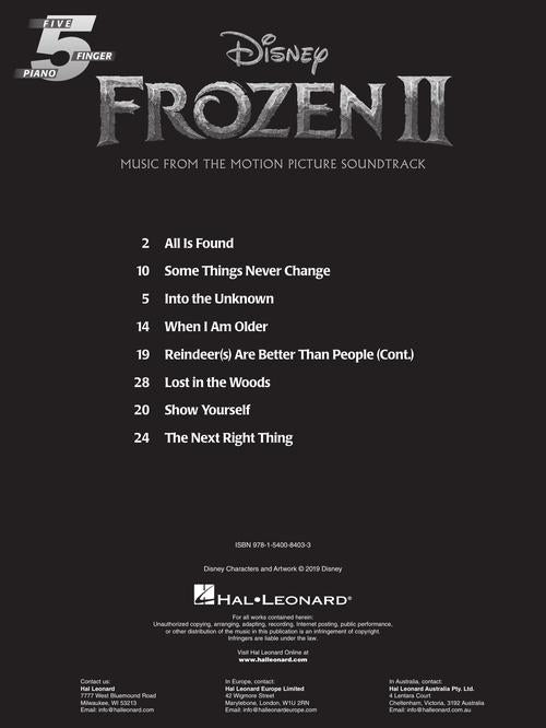 Frozen 2 Five-Finger Piano Songbook Music from the Motion Picture Soundtrack Publisher: Hal Leonard Category: Educational Keyboard Series: Five Finger Piano Songbook Format: Softcover The sequel to the uber-popular Disney film Frozen is here, and the...Regular price $20.99 -