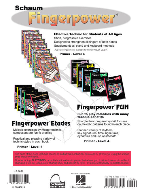 Arranger: Wesley Schaum Fingerpower® Fun Level 4 Intermediate Level Publisher: Schaum Publications Category: Educational Keyboard Series: Educational Piano Format: Softcover Musical experiences beyond the traditional Fingerpower® books that include fun to play pieces with finger exercises...Regular price $8.99