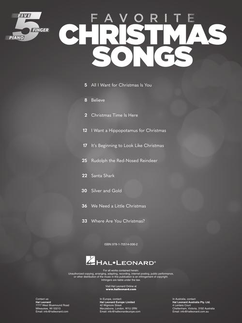 Favorite Christmas Songs for Five-Finger Piano Publisher: Hal Leonard Category: Educational Keyboard Series: Five Finger Piano Songbook Format: Softcover 10 Christmas favorites that even absolute beginners can play and sound great! Includes: All I Want for...Regular price $13.99 -