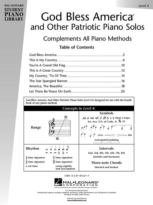 God Bless America® and Other Patriotic Piano Solos - Level 4 Hal Leonard Student Piano Library National Federation of Music Clubs 2014-2016 Selection Publisher: Hal Leonard Category: Educational Keyboard Series: Educational Piano Library Format: Paperback 8...Regular price $13.99 -