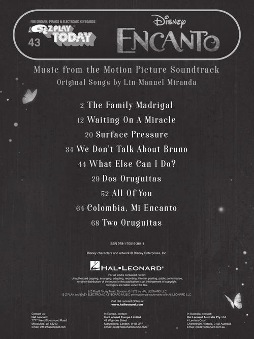 Encanto - Music from the Motion Picture Soundtrack E-Z Play Today #43 Publisher: Hal Leonard Category: Keyboard & Piano/Vocal/Guitar Series: E-Z Play Today Format: Softcover Now you can play the fun and infectious music from the...Regular price $17.99 -
