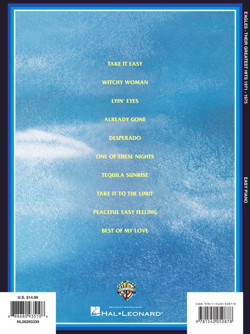 Eagles - Their Greatest Hits Publisher: Hal Leonard Category: Keyboard & Piano/Vocal/Guitar Series: Easy Piano Personality Format: Softcover Ten of the Eagles' best arranged for easy piano. Includes: Already Gone · Best of My Love ·...Regular price $17.99 -