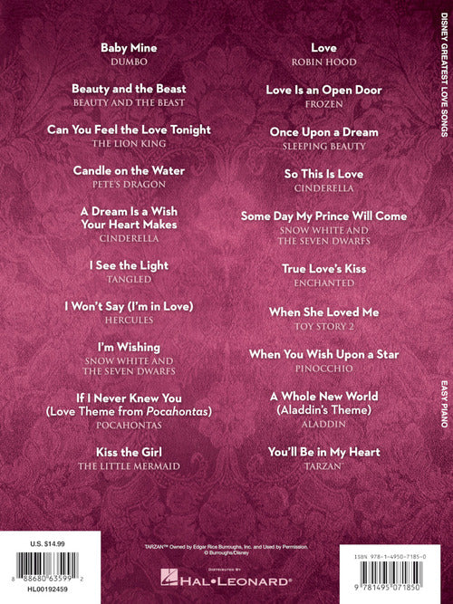 Disney Greatest Love Songs Publisher: Hal Leonard Category: Keyboard & Piano/Vocal/Guitar Series: Easy Piano Songbook Format: Softcover No one tells a love story like the songwriters behind Disney classics! This folio presents 20 of their best,...Regular price $27.99