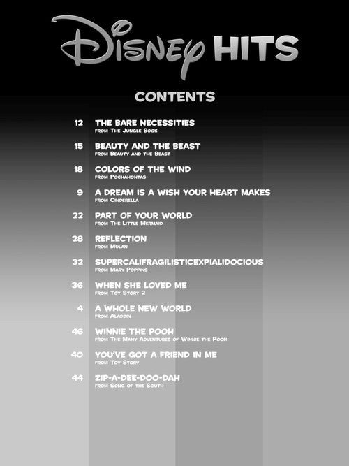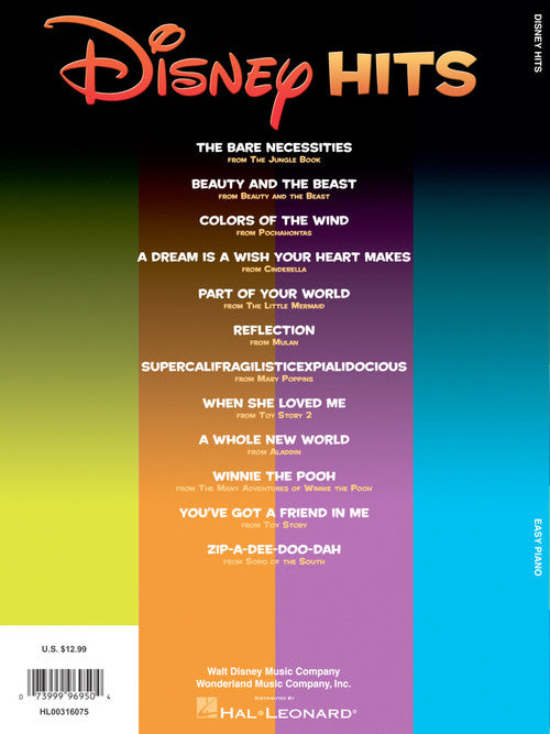 Disney Hits Publisher: Hal Leonard Category: Keyboard & Piano/Vocal/Guitar Series: Easy Piano Songbook Format: Paperback Easy arrangements of a dozen of Disney's most popular songs: The Bare Necessities · Beauty and the Beast · Colors of...Regular price $21.99 -