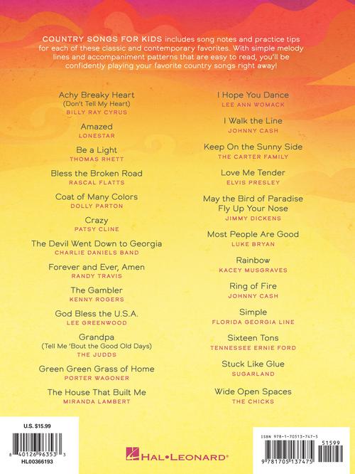 Country Songs for Kids Publisher: Hal Leonard Category: Keyboard & Piano/Vocal/Guitar Series: Easy Piano Songbook Format: Softcover Now kids can confidently play 25 favorite country songs right away! This collection of easy piano arrangements features simple...Regular price $19.99 -