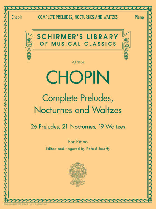 Complete Preludes, Nocturnes & Waltzes Schirmer Library of Classics Volume 2056 Publisher: G. Schirmer, Inc. Category: Keyboard & Piano/Vocal/Guitar Series: Piano Collection Format: Paperback This volume includes all of Chopin's 26 preludes, 21 nocturnes and 19...Regular price $27.99 -