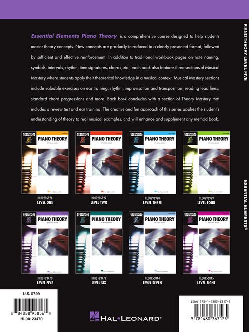 Essential Elements Piano Theory - Level 5 Publisher: Hal Leonard Category: Educational Keyboard Series: Educational Piano Library Format: Softcover Essential Elements Piano Theory is a comprehensive course designed to help students master theory concepts. New concepts...Regular price $10.99 -