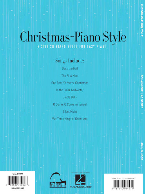 Arranger: John S. Hord Christmas - Piano Style 8 Stylish Piano Solos for Easy Piano Schaum Popular Series Publisher: Schaum Publications Category: Educational Keyboard Series: Educational Piano Format: Softcover Eight Christmas classics presented in stylish easy...Regular price $11.99 -