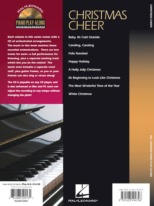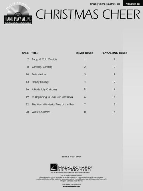 Christmas Cheer Piano Play-Along Volume 98 Publisher: Hal Leonard Category: Keyboard & Piano/Vocal/Guitar Series: Piano Play-Along Format: Softcover with CD Your favorite sheet music will come to life with the innovative Piano Play-Along series! With these...Regular price $17.99 -