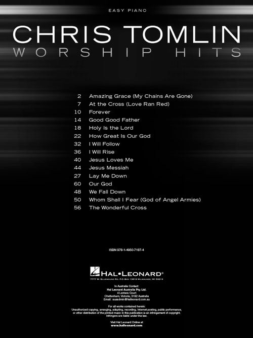 Chris Tomlin - Worship Hits Publisher: Hal Leonard Category: Keyboard & Piano/Vocal/Guitar Series: Easy Piano Personality Format: Softcover 15 songs arranged for easy piano from the best-selling, Grammy Award-winning Christian artist whose songs are sung by...Regular price $29.99 -