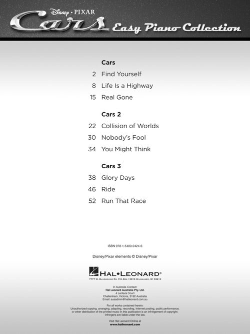 Cars - Easy Piano Collection Music from All 3 Disney Pixar Motion Pictures Publisher: Hal Leonard Category: Keyboard & Piano/Vocal/Guitar Series: Easy Piano Songbook Format: Softcover A trio of songs from each film in Disney/Pixar's Cars...Regular price $15.99