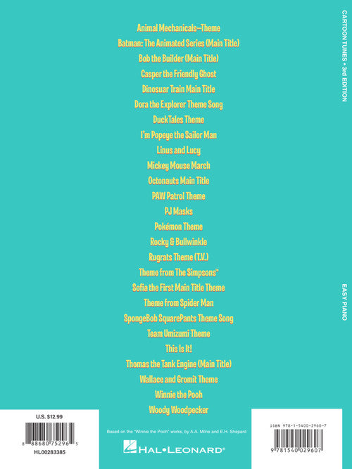 Cartoon Tunes - 3rd Edition Publisher: Hal Leonard Category: Keyboard & Piano/Vocal/Guitar Series: Easy Piano Songbook Format: Softcover 28 songs presented in easy piano notation with lyrics from a variety of animated series, including: Animal Mechanicals...Regular price $15.99 -