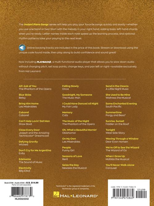 Composer: Various Broadway's Best Simple Sheet Music + Audio Play-Along Publisher: Hal Leonard Category: Keyboard & Piano/Vocal/Guitar Series: Instant Piano Format: Softcover Audio Online The Instant Piano Songs series will help you play your favorite songs...Regular price $21.99 -