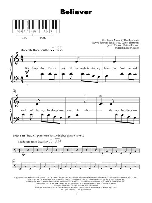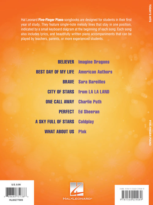 Today's Hits for Five-Finger Piano Publisher: Hal Leonard Category: Educational Keyboard Series: Five Finger Piano Songbook Format: Softcover Eight of today's hottest hits arranged in accessible five-finger piano arrangements for beginning players. Includes: Believer (Imagine Dragons)...Regular price $13.99 -