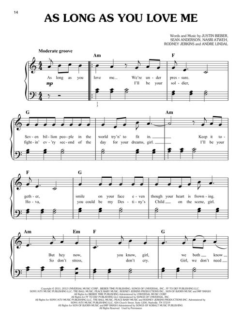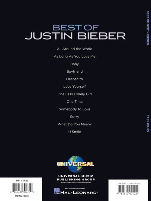 Best of Justin Bieber Publisher: Hal Leonard Category: Keyboard & Piano/Vocal/Guitar Series: Easy Piano Personality Format: Softcover A dozen of Bieb's best in accessible easy piano arrangements with lyrics: All Around the World · As Long...Regular price $17.99 -